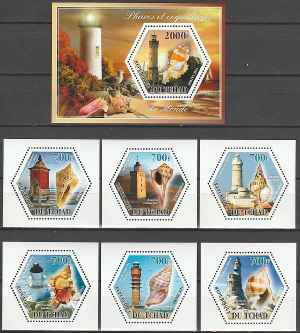 Маяки, Раковины, Чад 2014 г, 3 малых листа + 7 блоков. СУВЕНИРНЫЙС НАКЛЕЙКОЙ. (ячс
