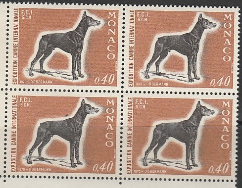 Монако 1970 год. Международная выставка собак в Монте-Карло. Собака породы доберман. квартблок. (1,3)
