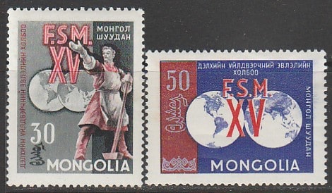 Монголия 1960 год. 15 лет Всемирной федерации профсоюзов, 2 марки (наклейка)