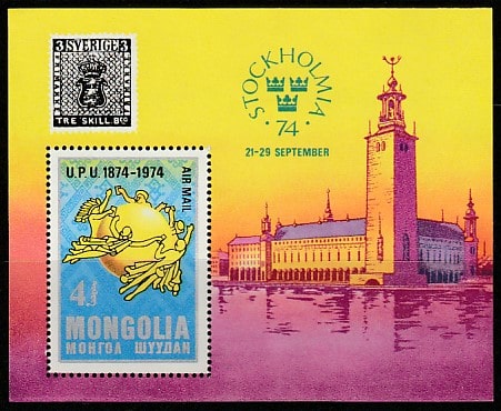 Монголия 1974 год. 100 лет Всемирному почтовому союзу, блок (наклейка)