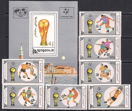 Монголия 1990 год. ЧМ по футболу в Италии. 7 марок + блок