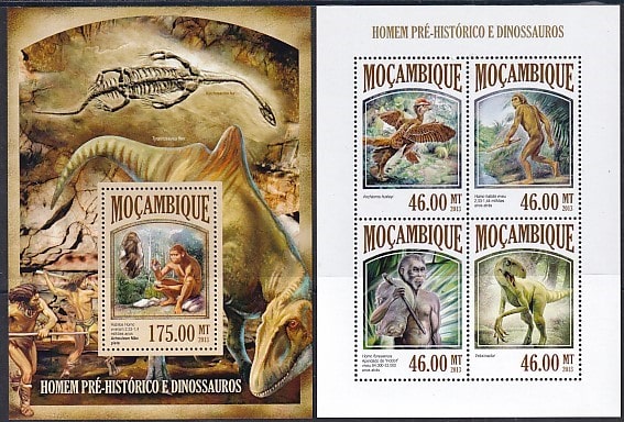 Мозамбик 2013 год. Доисторические люди и динозавры, малый лист + блок