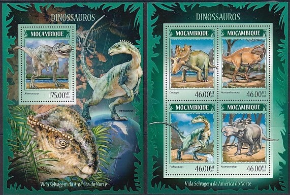 Мозамбик 2014 год. Динозавры, малый лист + блок