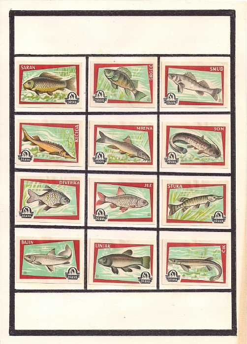 Набор иностранных спичечных этикеток. Чехословакия. Речные рыбы. 12 штук. НАКЛЕЕНЫ