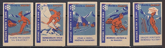 Набор иностранных спичечных этикеток, зимний спорт, опасно, 5 штук