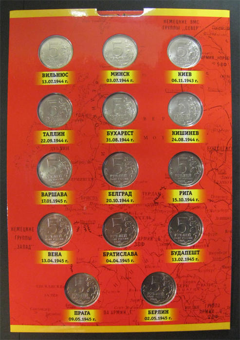 Главная › Каталог › МОНЕТЫ › Наборы монет › Набор монет Города-Столицы освобожденные советскими войсками от немецко-фашистских захватчиков. 14 монет в планшете.