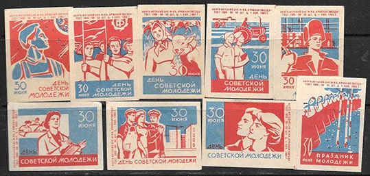 Набор спичечных этикеток. 30 июня- День советской молодежи! 1963 год. 9 шт.
