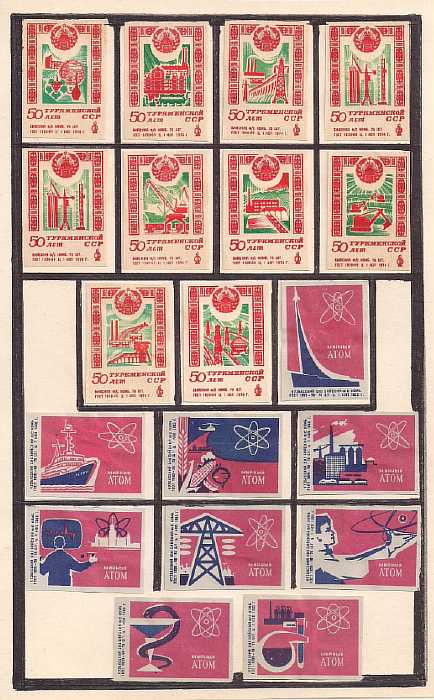 Набор спичечных этикеток. 50 лет Туркменской ССР, 1974 год. Мирный атом, 1965 год. 19 штук на листе