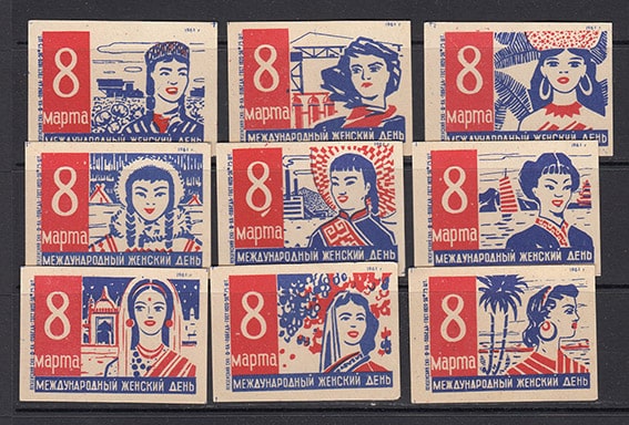 Набор спичечных этикеток. 8 марта, 1961 год, сине-красные на белой бумаге, 9 штук