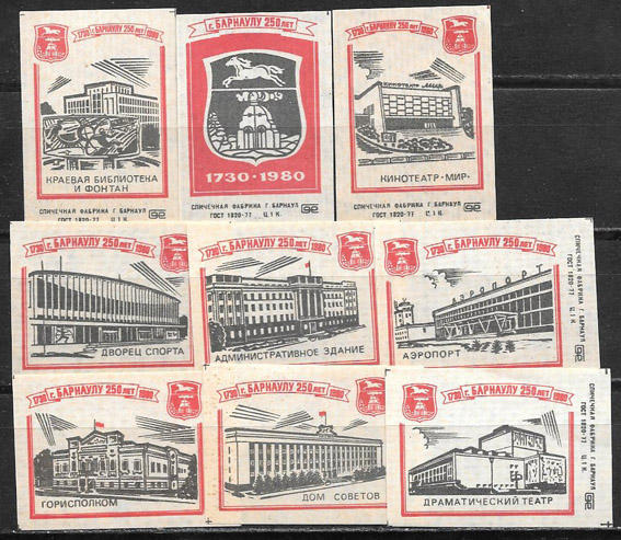 Набор спичечных этикеток. Барнаулу-250 лет. 9 шт. 1980 год