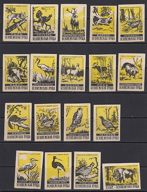 Набор спичечных этикеток. Беловежская пуща, 18 штук желтые