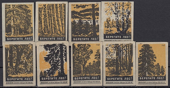 Набор спичечных этикеток. Берегите лес! 1960 год, 9 штук, желтые на серой бумаге