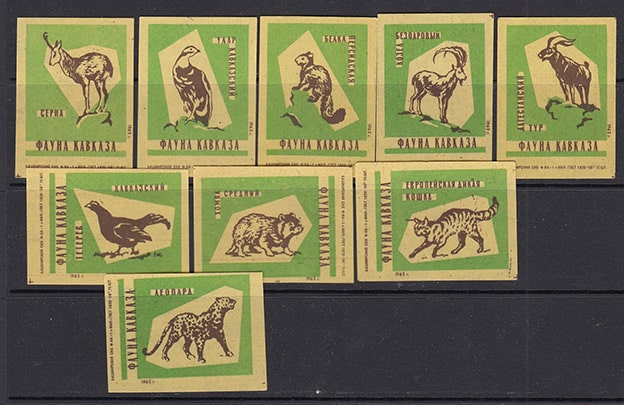Набор спичечных этикеток. Фауна Кавказа, 1962 год. Зеленые на желтой бумаге, 9 штук