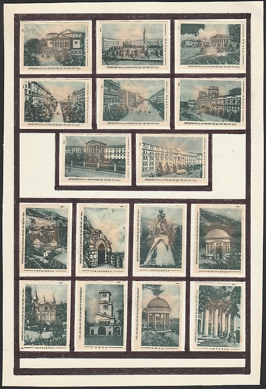 Набор спичечных этикеток. Города СССР, 1960 год, 16 штук (II) Кировский СНХ, ф-ка "Красная Звезда". (наклеены на лист 175/250 мм)