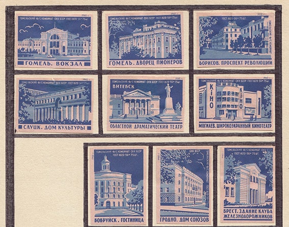 Набор спичечных этикеток. Города СССР, 1960 год, голубой цвет, розовая бумага, 9 штук на листе