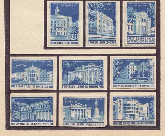 Набор спичечных этикеток. Города СССР, 1960 год, голубой цвет, серая бумага, 9 штук на листе