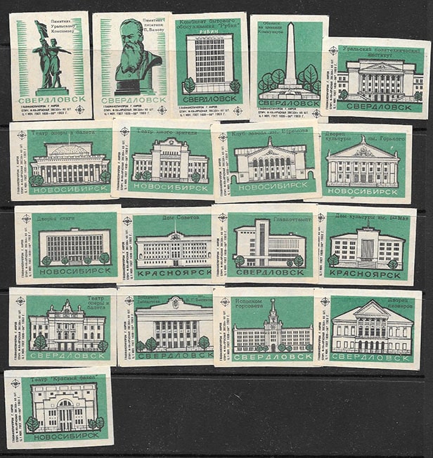 Набор спичечных этикеток. Красноярск. Новосибирск. Свердловск. 1969 г. 18 шт.