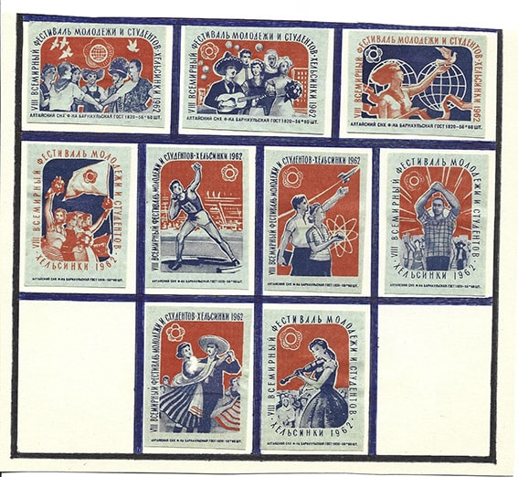 Набор спичечных этикеток НА ЛИСТЕ. Фестиваль молодежи, 1962 год. 9 штук