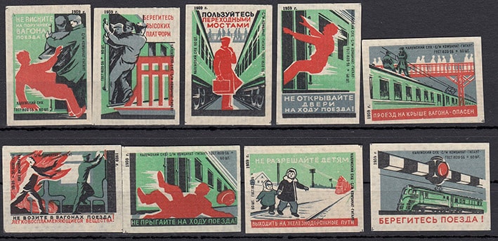 Набор спичечных этикеток. Осторожно железная дорога, 1959 год, 9 штук
