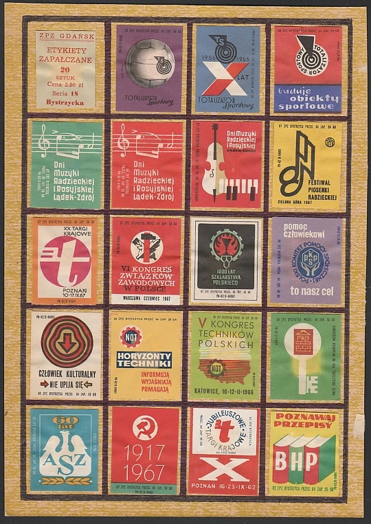 Набор спичечных этикеток. Польша, Быстшица. Реклама, пропаганда, искусство, 19 штук (наклеены на лист 180/255 мм)