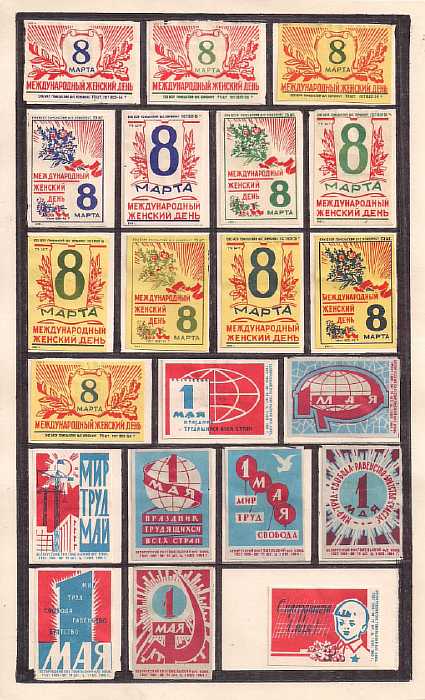 Набор спичечных этикеток. Праздники 8 марта и 1 мая, 1959 год. 21 штук на листе