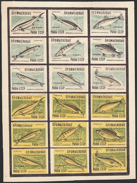 Набор спичечных этикеток. Промысловые рыбы СССР, 1959 год, 18 штук (I). Кировский СНХ, ф-ка "Красная Звезда". (наклеены на лист 175/250 мм)