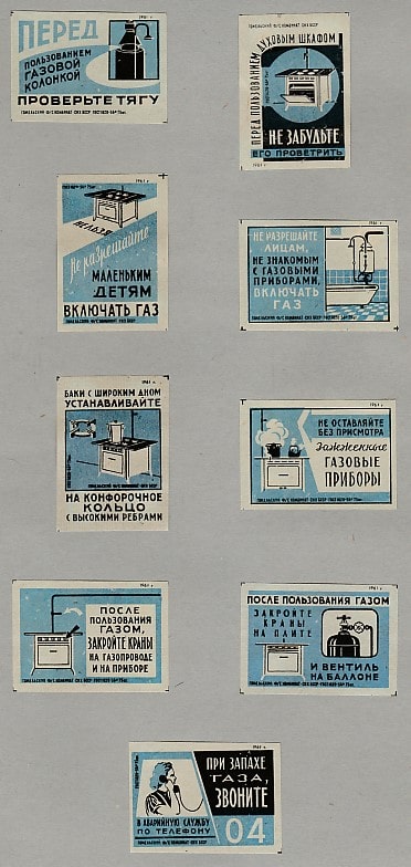 Набор спичечных этикеток. Пропаганда безопасного пользования газом в быту, 1961 год, 9 штук (синие)