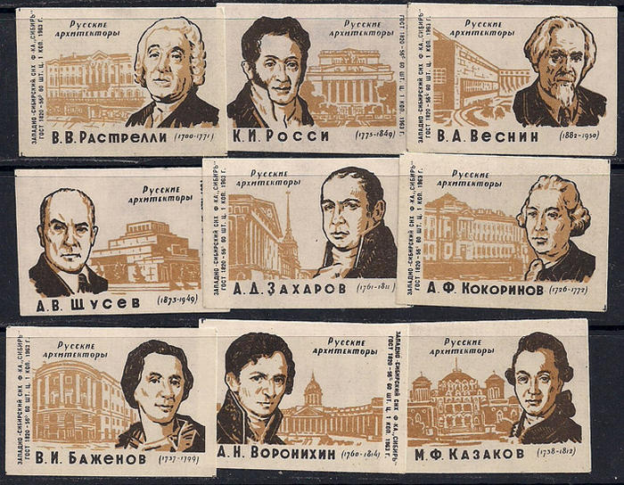 Набор спичечных этикеток. Русские архитекторы. 1963 г. 9 шт.