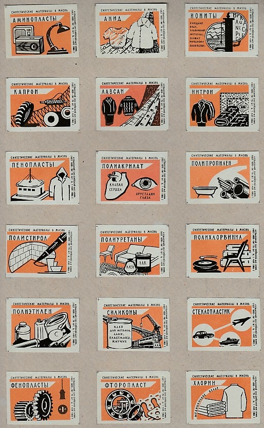 Набор спичечных этикеток. Синтетические материалы - в жизнь, 1965 год, 18 штук.