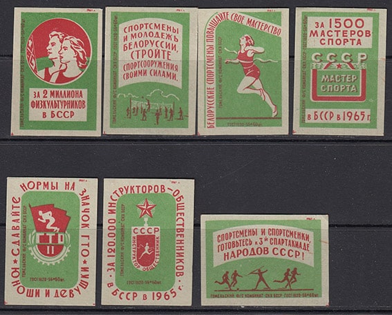 Набор спичечных этикеток. Спорт в БССР, 1961 год, зеленые на зеленой бумаге, 7 штук