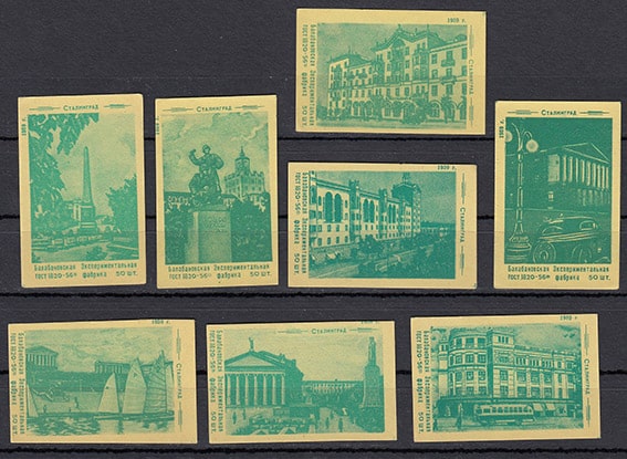 Набор спичечных этикеток. Сталинград, зеленые на желтой бумаге, 1959 год, 8 штук