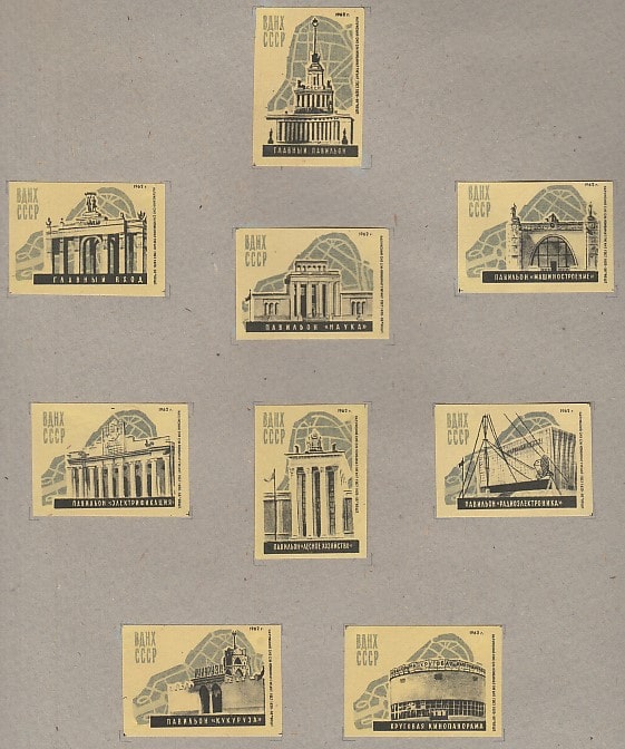 Набор спичечных этикеток. ВДНХ СССР, 1962 год, 9 штук.