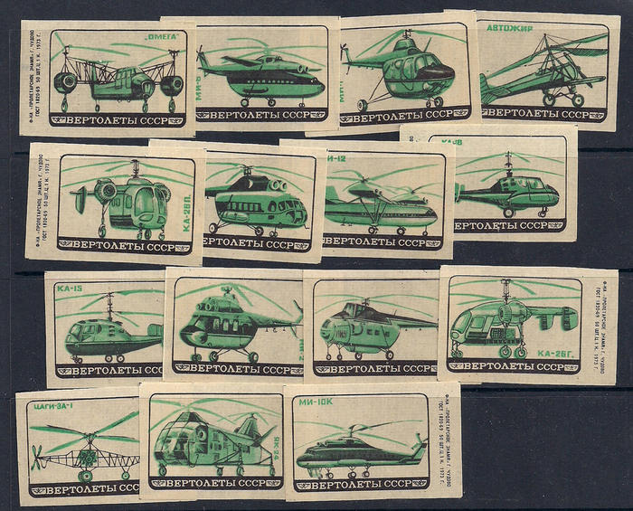 Набор спичечных этикеток. Вертолеты. 1973 г. 15 шт.