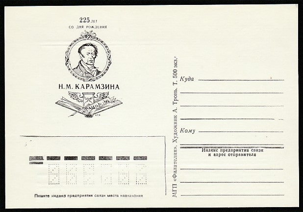 Немаркированная ПК. 225 лет со дня рождения Н.М. Карамзина, 1991 год. МГП "Филателия". Тир. 500 экз.