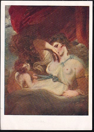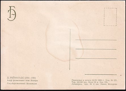 Немаркированная ПК "Д. Рейнольдс. Амур развязывает пояс Венеры", 30.11.1959 год, (пятно на обороте)