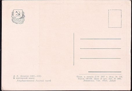Немаркированная ПК "А. Е. Архипов. В мастерской масок". Выпуск 5.04.1957 год