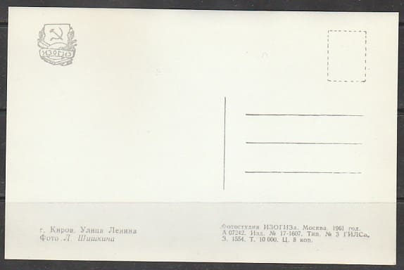 Немаркированная ПК. Город Киров. Улица Ленина, 1961 год, "ИЗОГИЗ".