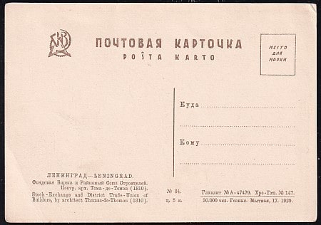 Немаркированная ПК Ленинград. Фондовая Биржа. Выпуск 1929 год
