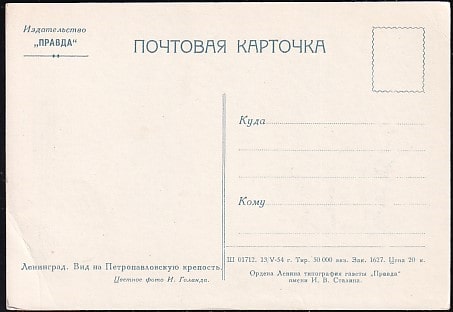 Немаркированная ПК Ленинград. Вид на Петропавловскую крепость. Выпуск 13.05.1954 год