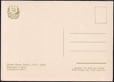 Немаркированная ПК "Меркурий и Аргус" Питер Пауль Рубенс. Выпуск 1956 год