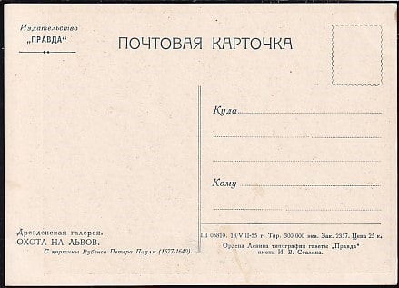 Немаркированная ПК "Охота на львов" П. П. Рубенс. Выпуск 18.08.1955 год