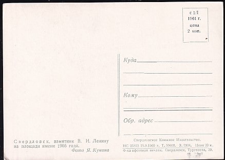 Немаркированная ПК "Свердловск. Памятник В. И. Ленину". Выпуск 15.09.1960 год