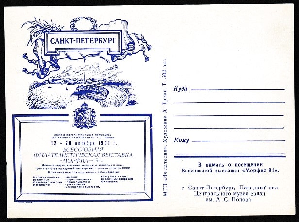 Немаркированная ПК. Всесоюзная филвыставка "Морфил-91", 1991 год. МГП "Филателия". Тир. 500 экз.