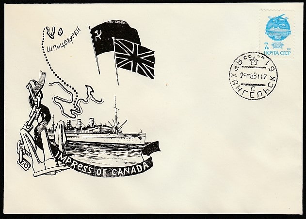 Немаркированный конверт. Лайнер английского конвоя "Императрица Канады", 1991 год, штемпель гашения.