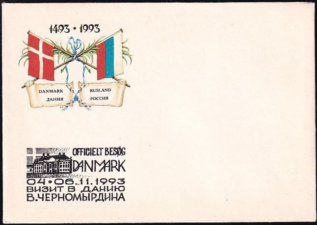 Немаркированный конверт с надпечаткой Визит в Данию В. Черномырдина 04-06.11.1993 год