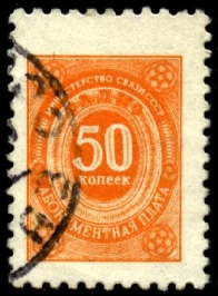 Непочтовая гашеная марка министерства связи СССР (12 х 20 мм). Абонентская плата 50 копеек