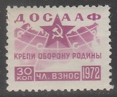 Непочтовая марка 1972 год. ДОСААФ, членский взнос 30 коп., 1 марка.