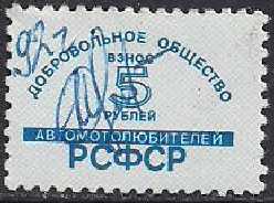 Непочтовая марка добровольного общества автомотолюбителей РСФСР 1992 год (5 рублей). Погашена