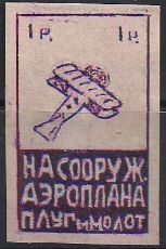Непочтовая марка ОДВФ "На сооружение аэроплана "Плуг и Молот" 1 рубль (фиолетовая). Репринт