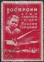Непочтовая марка "Построим агитсамолет-гигант" (М. Горький), надорвана